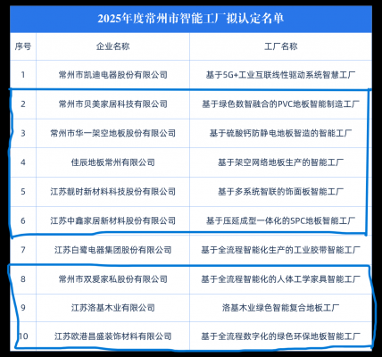 近日,常州市工信局公布了2025年度常州市智能工厂拟认定名单,横林绿色家居产业集群的贝美家居、华一地板、佳辰地板、靓时新材料、中鑫家居、双爱家私、洛基木业、欧港昌盛8家企业获评入选。