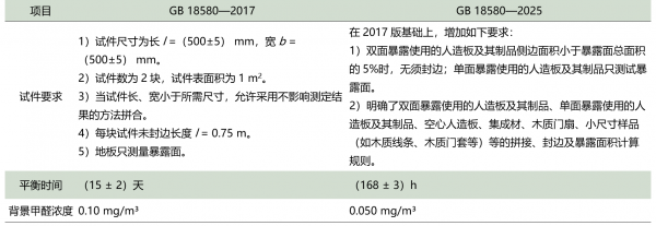 GB 18580—2025与2017版,在试验方法原理上保持一致,但在试件要求和平衡时间上作了修改调整。GB 18580—2017按照GB/T 17657—2013《人造板及饰面人造板理化性能试验方法》中4.60甲醛释放量测定——1 m3气候箱法的规定进行。新版标准在保留1 m3气候箱法作为核心检测方法的基础上,针对实际应用中存在检测周期长、成本高等问题进行了优化,旨在提升检测效率的同时确保结果的科学性和可操作性。GB 18580—2025与GB 18580—2017在试验方法方面的对比,详见表1。