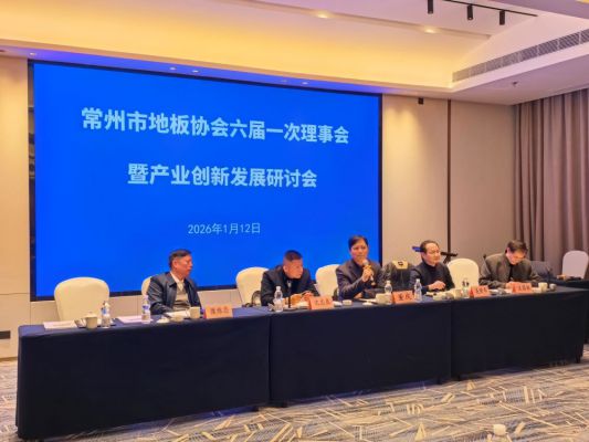 2026年1月12日,常州市地板协会六届一次理事会暨产业创新发展研讨会在横林福朋喜来登酒店召开,全体理事参会。五届会长濮维忠致辞,会长沈志良做工作报告,镇长董庆到会讲话,镇综合保障中心主任吴晓冬做产业发展专题发言;应急和综合执法、生态和农村、经济发展等部门负责人以及贝尔、正永、双爱、佳饰家、中鑫、鑫德源恒等副会长和理事企业负责人参与研讨对话。