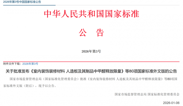 根据2026年1月6日中华人民共和国国家标准公告(2026年第3号)“关于批准发布《室内装饰装修材料 人造板及其制品中甲醛释放限量》等80项国家标准外文版的公告”,由全国人造板标准化技术委员会、全国木材标准化委员会原木锯材分技术委员会和全国林业生物质材料标准化技术委员会分别归口管理的GB/T 18580—2025(EN)《室内装饰装修材料 人造板及其制品中甲醛释放限量》、GB/T 20446—2022(EN)《木线条》和GB/T 24508—2020(EN)《木塑地板》国家标准英文版正式发布。