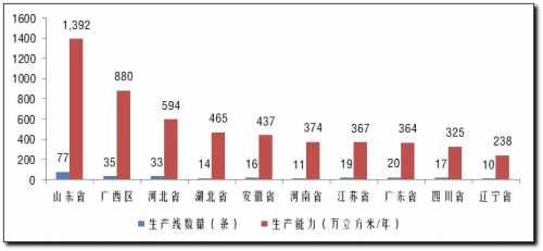 山东省生产能力基本持平达到1392万立方米/年,分布在临沂、菏泽、潍坊、济宁、聊城、日照、烟台、泰安、枣庄和德州等10个地市,占全国生产能力的21.2%,继续保持全国第一;其中临沂市生产能力占全省的47.2%,达到657万立方米/年。