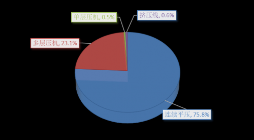 不同类型压机的刨花板生产线产能占比(2025年底)