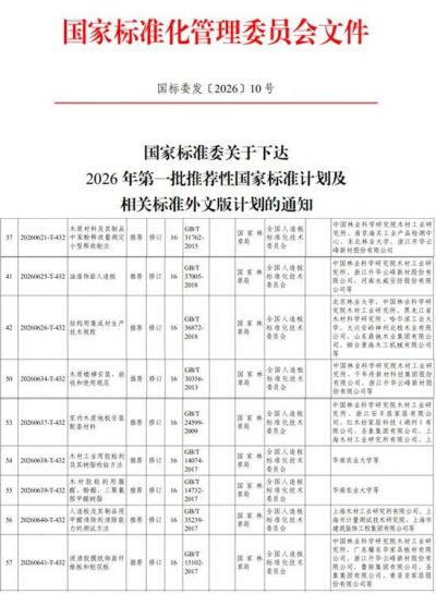 根据2026年1月28日《国家标准委关于下达2026年第一批推荐性国家标准计划及相关标准外文版计划的通知》(国标委发〔2026〕10号),由全国人造板标准化技术委员会组织申报并归口管理的《浸渍胶膜纸饰面纤维板和刨花板》《油漆饰面人造板》等9项人造板国家标准修订计划获批立项。