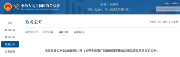 为进一步促进跨境电商出口,海关总署日前发布《关于全面推广跨境电商零售出口商品跨关区退货的公告》(2026年第24号),自2026年4月1日起施行。